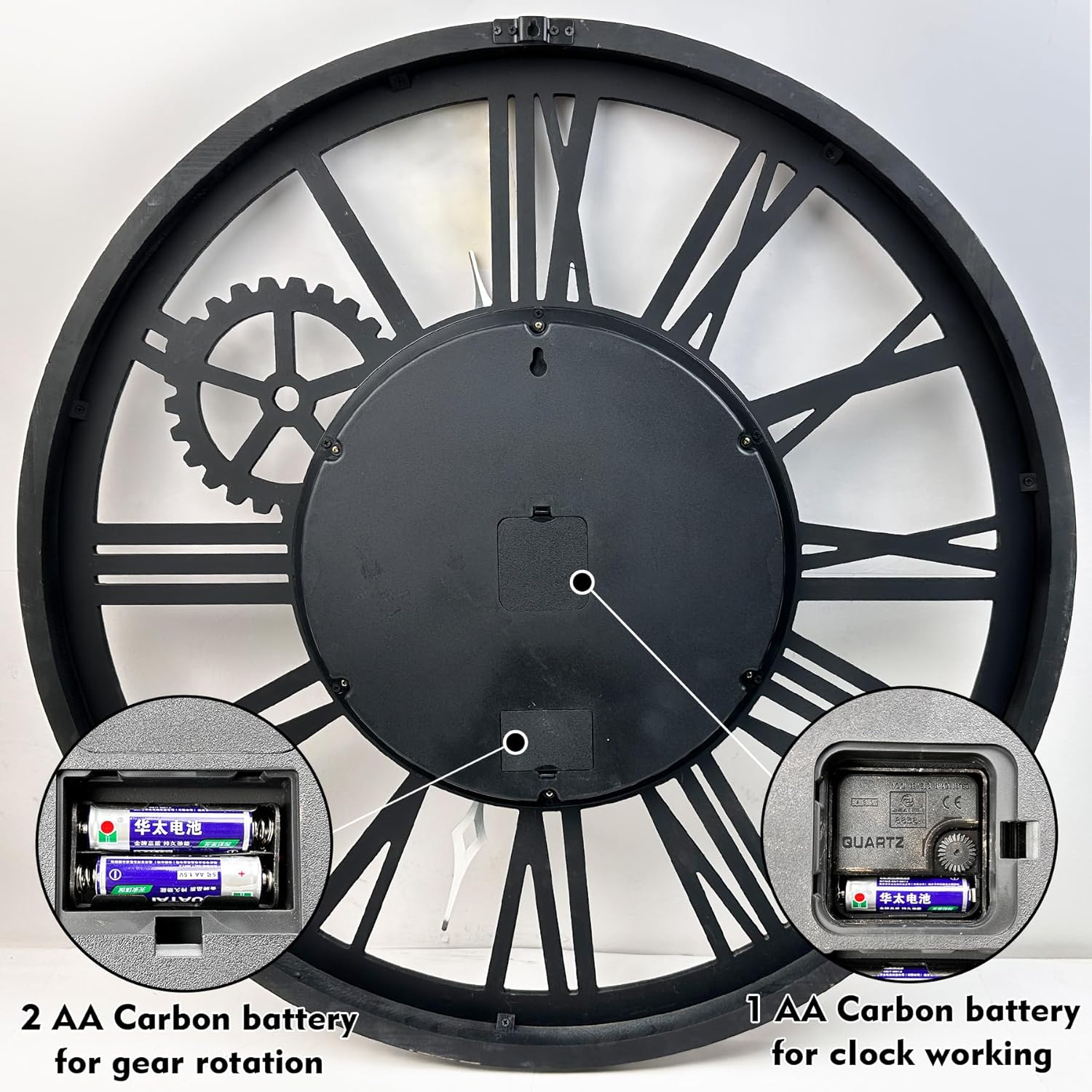 - ACCURATE TIME& BATTERY OPERATED: Quality quartz sweeping mechanism for accurate time without any ticking sounds. Power by 3 AA Carbon battery operated (not included), large industrial clock takes 2 sets of batteries, one set for the clock and the other for gears that spin. Both of them can be used individually.