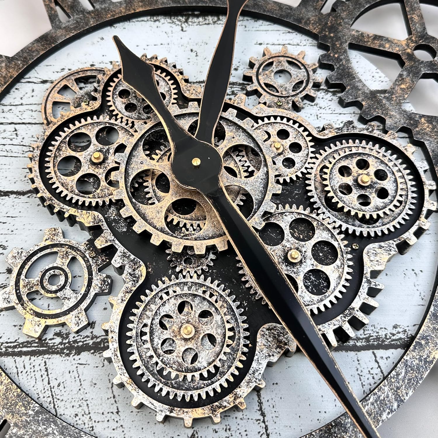 - REAL MOVING GEARS: Large wall clock with unique moving parts is as attractive as it is functional. Put batteries in, various gears start rotating fluently. Moving gear wall clock is amazing looking on the wall and will get so many compliments on it. Made from solid wood and painted by Rust-like color on wall clock create a very rustic and industrial atmosphere. Farmhouse wall clock is professionally handmade and pursuit of naturalness, so it may have some little imperfections.