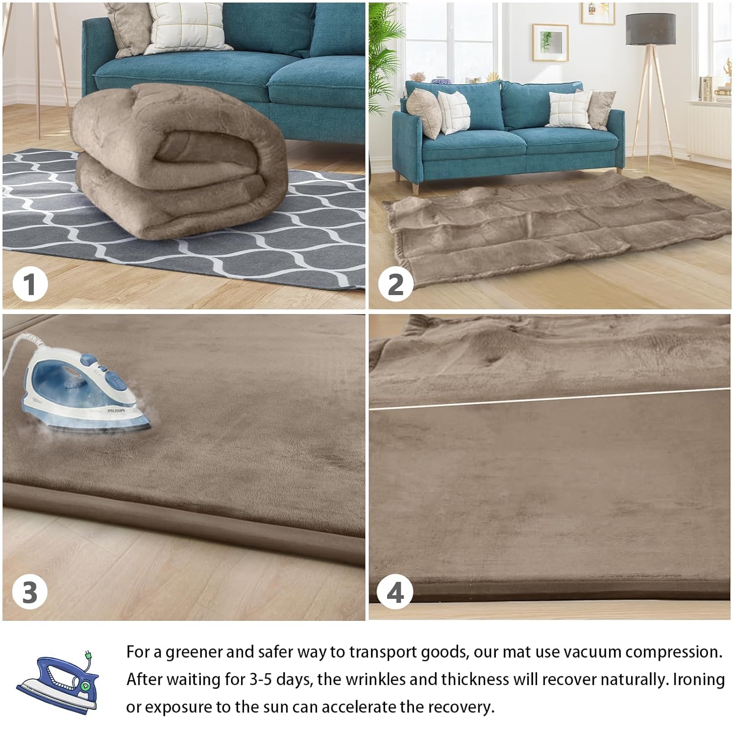 - 🌟HOW TO CARE FOR YOUR MAT:When you open the package,it may be wrinkled,very flat and inelastic.Don't fret - this is normal! As long as it is left for 3-5 days, the mat will naturally regain its thickness and elasticity. we recommend steaming or ironing it to speed up recovery. After you have completed the steaming/ironing, your thick floor padded mat should rebound and be ready to use!